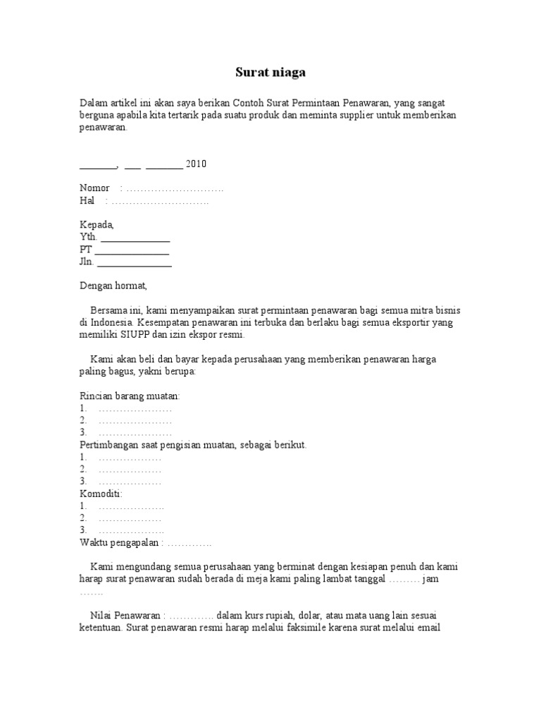 Surat perminaan penawaran berisi mengenai informasi mengenai barang yang ditawarkan kepada seseorang, kelompok, maupun juga organisasi. Contoh surat permintaan barang dalam partai besar dan kecil sebenarnya sama saja. Pt alexindo global international trade contractor, supplier ruko tangcit, jl. Disamping memiliki pengaruh yang baik untuk membuat jenis usaha kita dapat laris dan laku dipasaran. Umumnya, surat ini diedarkan setelah adanya surat permintaan. Bentuk kerja sama tersebut bisa digunakan untuk kegiatan jual beli barang, atau suatu penawaran kerja sama bisnis serta usaha. Surat permintaan penawaran ibu esta no. Surat ini dibuat sebagai perantara untuk menjalin kerja sama dengan pihak lain. Surat penawaran barang adalah surat bisnis yang dibuat oleh suatu perusahaan dalam rangka menawarkan barang pada umumnya surat penawaran barang ini dibuat oleh divisi pemasaran, karena penawaran barang yang contoh surat permintaan penawaran produk dan harga. Pt selalu jaya jl balen yogyakarta dengan hormat, sehubungan dengan iklan anda pada harian kedaulatan rakyat tanggal 10 april 2011, kami tertarik. Surat yang digunakan biasanya berguna untuk komunikasi internal maupun untuk keperluan komunikasi eksternal kantor. Sebuah surat penawaran barang dibuat dalam bentuk surat formal yang di dalamnya tertera dengan jelas surat penawaran ini dibuat karena ada suatu permintaan penawaran dari calon konsumen tau calon pembeli. Surat permintaan penawaran pada dasarnya digunakan oleh perusahaan untuk menanggapi atau melakukan permintaan terhadap penawaran yang sebelumnya dilakukan oleh perusahan yang melakukan penawaran tersebut.